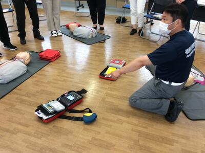 7月25日に、福島南消防署において心肺蘇生法・AED実技講習会を実施しました。救急第一係 菅野正浩様より、救命処置の方法について、実践的に教えていただきました。