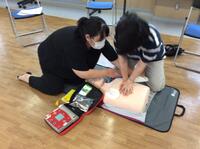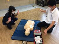 心肺蘇生法では、「強く、速く、絶え間なく、胸はしっかり戻す」が、適切な胸骨圧迫における重要なポイントであることを学びました。AED実技講習では、使用順序について説明していただいた後、実際の場面を想定しながら胸骨圧迫と組み合わせて訓練を行いました。AEDが2回目の心電図解析を行うまで、数人で交代しながら絶え間なく胸骨圧迫を行いましたが、日ごろは短いと感じる2分間が、ここではとても長く感じられました。救命処置には、かなりの体力と人手が必要だということを実感することができました。